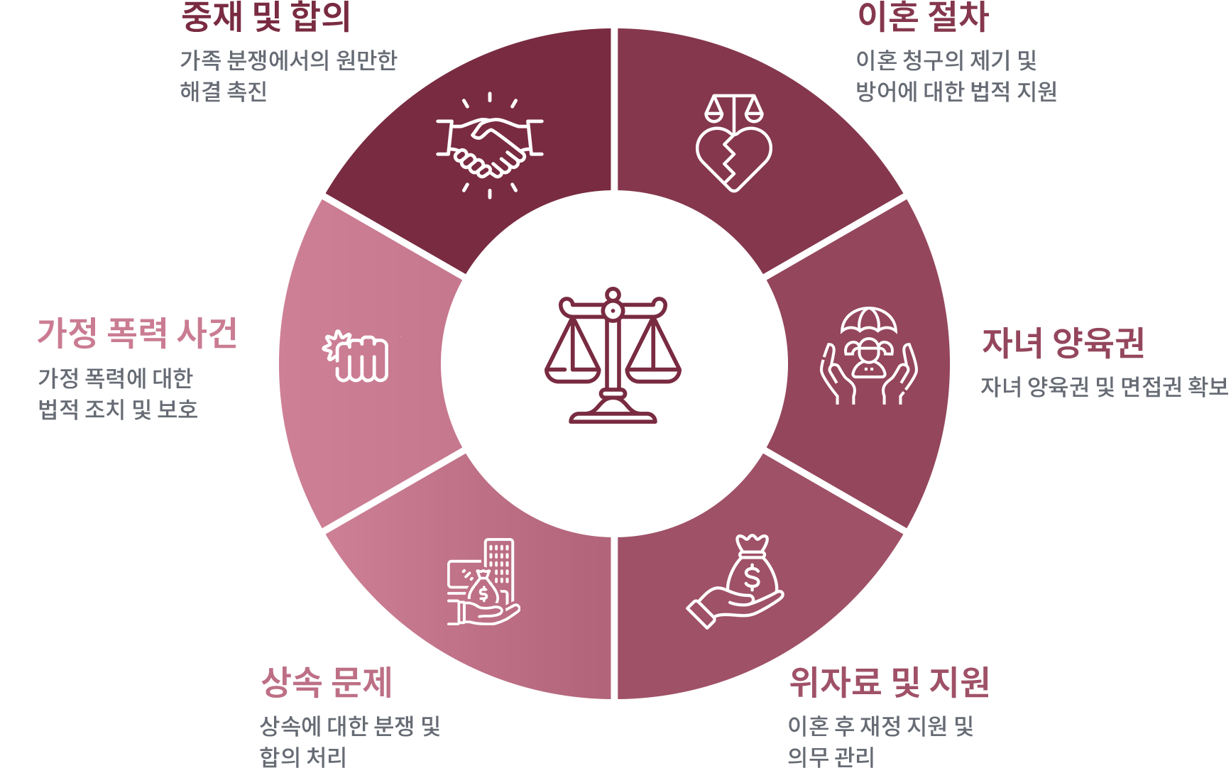 법무법인 B&H는 감정 다툼이 수반되는 가사 사건의 특성을 고려하여 의뢰인의 고충을 깊이 이해하고 최적의 법적 솔루션을 제안합니다. 축적된 전문 지식을 바탕으로 소송 진행 중 발생하는 세부 절차를 활용해 의뢰인이 원하는 바를 신속하고 정확하게 달성할 수 있도록 지원합니다. 복잡한 가사소송 과정에서 책임감을 가지고 의뢰인의 마음을 배려하며 세심하게 사건 진행을 도와드립니다.