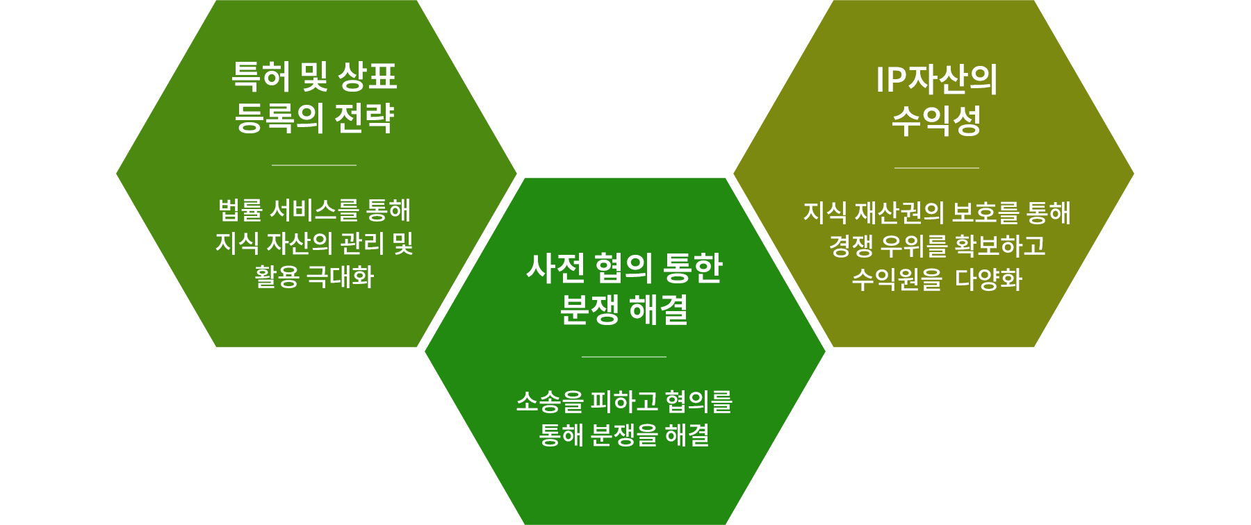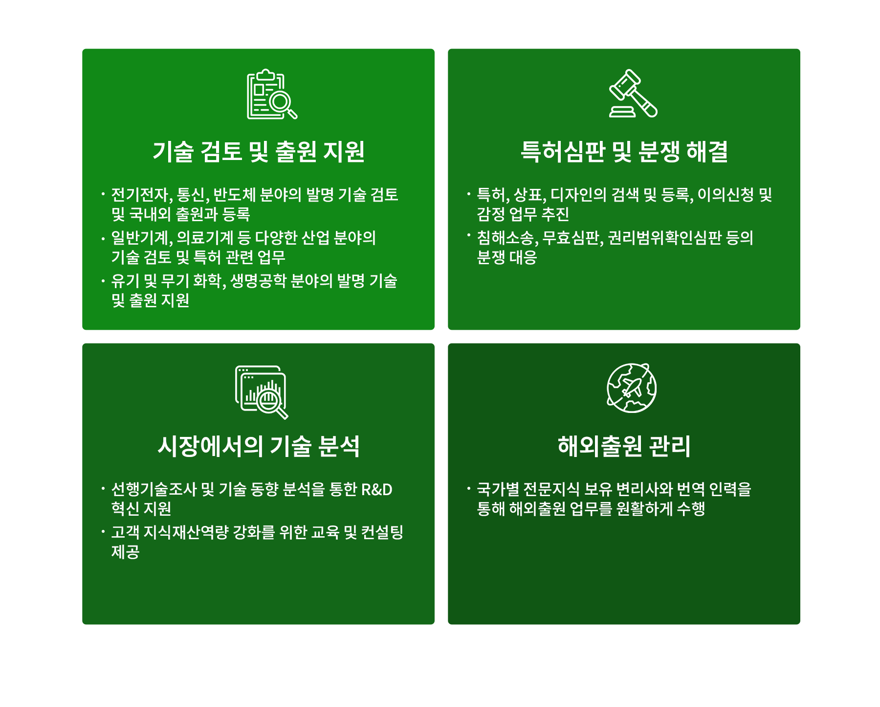법무법인 B&H 지적재산권 센터는 국내외 특허, 상표, 디자인 출원 및 등록 절차를 수행하며, 고품질의 특허 서비스와 R&D 현장에서 필요한 지식재산권 관리 솔루션을 종합적으로 제공합니다. 변리사와 협업하여 특허출원부터 분쟁 해결까지 전문적인 논스톱 서비스를 제공하며, 고객의 지식재산 관리 역량 향상을 지원합니다.